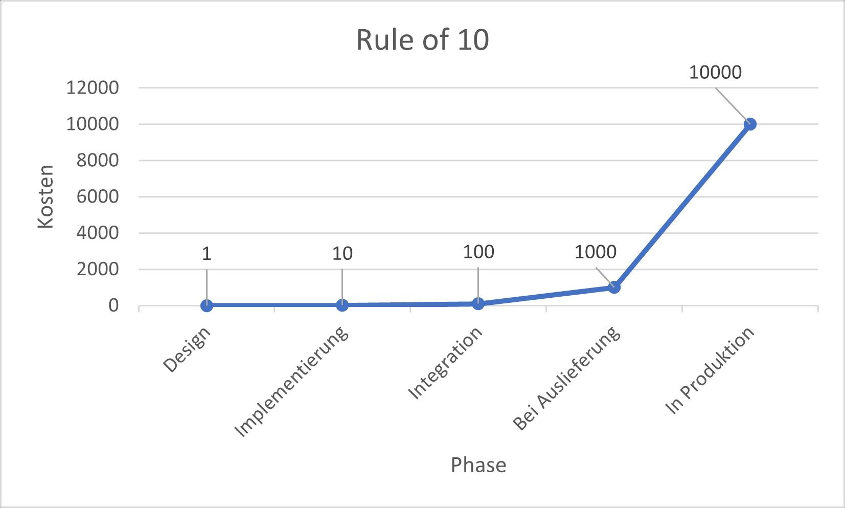 Im Produktdesign spricht man von der Rule of 10. Das bedeutet, dass die Fehlerbehebungskosten mit jeder Phase, die ein Produkt von der Konzeption bis hin zur Inbetriebnahme fortschreitet, um den Faktor 10 steigen. Angewendet auf die Softwareentwicklung sieht das (mit fiktiven Zahlen) etwa wie folgt aus: