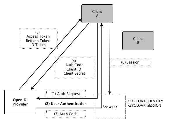 Abbildung 2 zeigt den Ablauf der Authentifizierung mit OpenID Connect. Der Browser ist die zentrale Komponente, der für die Kommunikation zwischen Client und OP verwendet wird. Wenn der Benutzer eine geschützte Resource anfragt und noch keine gültige Session vorliegt, wird er für einen (1) Auth Request zum OP weitergeleitet. Nach erfolgreicher (2) Authentifizierung, z.B. durch Eingabe von Benutzername und Passwort, erhält der Client den (3) Auth-Code. Der Auth-Code wird dann vom Client (4+5) direkt beim OP zu Access, Refresh und Identity Token ausgetauscht. Der Client identifiziert sich mit seiner ID und einem Secret, das initial bei der Erstellung des Clients in Keycloak erzeugt wird. Dieser spezifische Grant Authorization Flow kann nur für Anwendungen durchgeführt werden, denen zugetraut werden kann, das Secret sicher zu verwahren. Eine JavaScript-Anwendung beispielsweise würde einen anderen Flow verwenden müssen, da das Token nicht sicher verwahrt werden kann. Abschließend setzt der Browser die (6) Session.