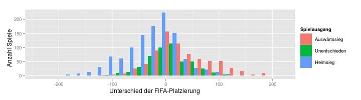 Eine (hoffentlich guter) Indikator für die relative Stärke der Kontrahenten bei Fußball-Länderspielen ist die FIFA-Weltrangliste. Die Ranglisten werden monatlich veröffentlicht. Auf der FIFA-Homepage können alle vergangenen Ranglisten bis ins Jahr 1992 eingesehen werden. Mit einem kleinen R-Skript können nun die FIFA-Platzierung der Kontrahenten zum Zeitpunkt des Spiels zu ermittelt werden. Dabei leistet mapply gute Dienste. Im folgenden Histogramm sieht man die Verteilung von Siegen und Niederlagen abhängig vom Unterschied der FIFA-Platzierung der beiden Kontrahenten: