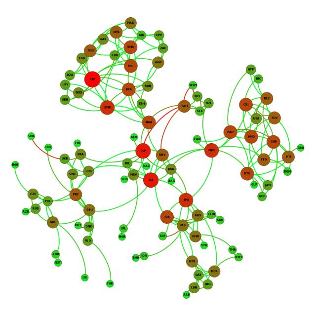 Technisch gesehen, suchen wir im Graphen mit allen Länderspielen die Pfade vom Knoten Deutschland zum Knoten Italien. Davon gibt es sehr viele. Deshalb einige Einschränkungen: Die maximale Länge der Pfade wird auf MAX_PATH_LENGTH begrenzt. Außerdem werden nur Spiele betrachtet, die maximal MAX_YEARS_BACK Jahre in der Vergangenheit liegen. Zusätzlich werden noch zwei Faktoren zur Gewichtung verwendet: Je größer PATH_LENGTH_WEIGHT gewählt wird, desto weniger stark werden lange Pfade gewichtet. Je größer TIME_WEIGHT gewählt ist, desto weniger stark werden lange zurück liegende Spiele gewichtet. Die berechneten Features sind unter der Bezeichnung b_graph_score_[MAX_YEARS_BACK]_[MAX_PATH_LENGTH]_[TIME_WEIGHT]_[PATH_LENGTH_WEIGHT] in der finalen Feature-Datei /2-compute-features/3-graph-based/output/games-with-graph-features.csv zu finden.