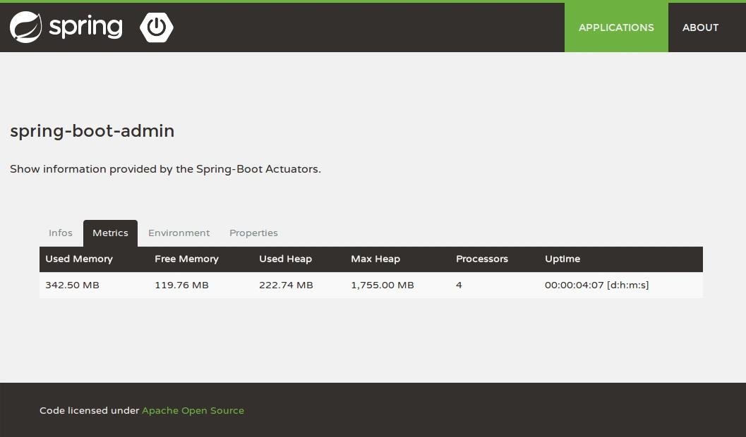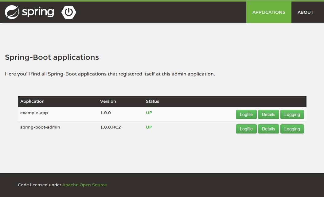 Wie sollte es anders sein, auch dieses Anwendung wurde als Spring Boot Anwendung entwickelt. Der Name dieser Anwendung lautet spring-boot-admin und wird hier im folgenden auch so bezeichnet. Sie basiert folglich auf dem Spring Framework, jedoch Client-seitig auf AngularJS. Mit AngularJS werden die Spring Boot REST-Endpoints der einzelnen Anwendungen angeprochen und entsprechend visualisiert. Das Design wurde ist an das SpringIO -Design angelehnt bzw. wurde von dort auch teilweise kopiert (HTML Struktur / CSS).