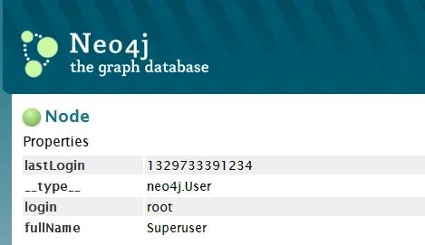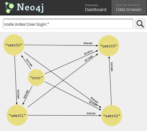 Zur besseren Lesbarkeit haben wir eine Methode knows(...) spendiert, die den übergebenen User der Menge der bekannten User hinzufügt. Kennt man die Id eines gespeicherten Knotens, kann man dessen Daten im Browser anzeigen lassen: