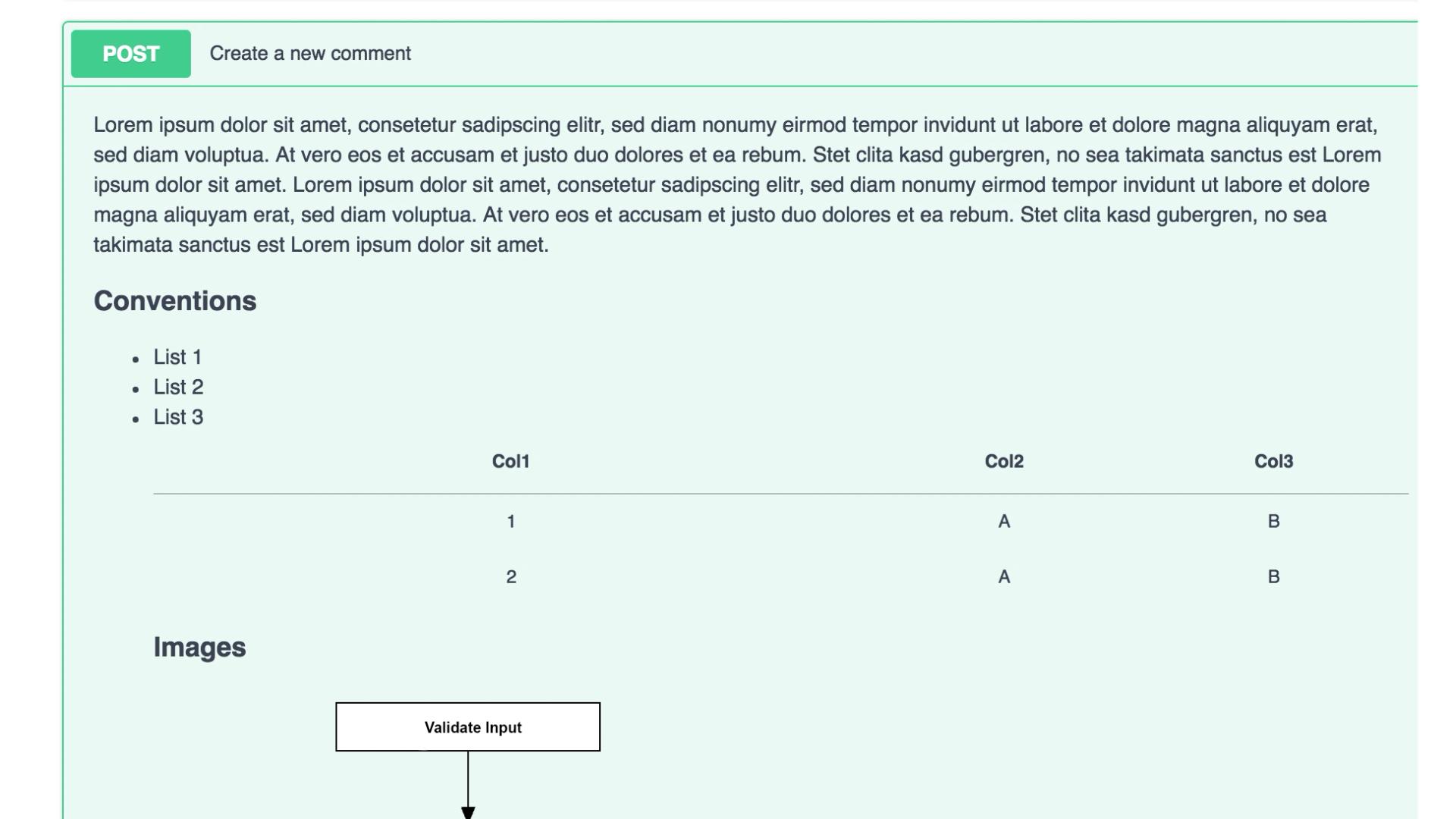 Die hier genutzte addComment.md Markdown-Datei muss in dieser Implementierung im Classpath bzw. dem resource-Verzeichnis der Anwendung vorhanden sein. Die folgende Abbildung zeigt die Swagger Dokumentation für den oben dargestellten REST-Endpunkt addComment mit Markdown-Elementen wie Tabellen und Bildern. Für die Darstellung der Dokumentation wurde Swagger-UI verwendet.