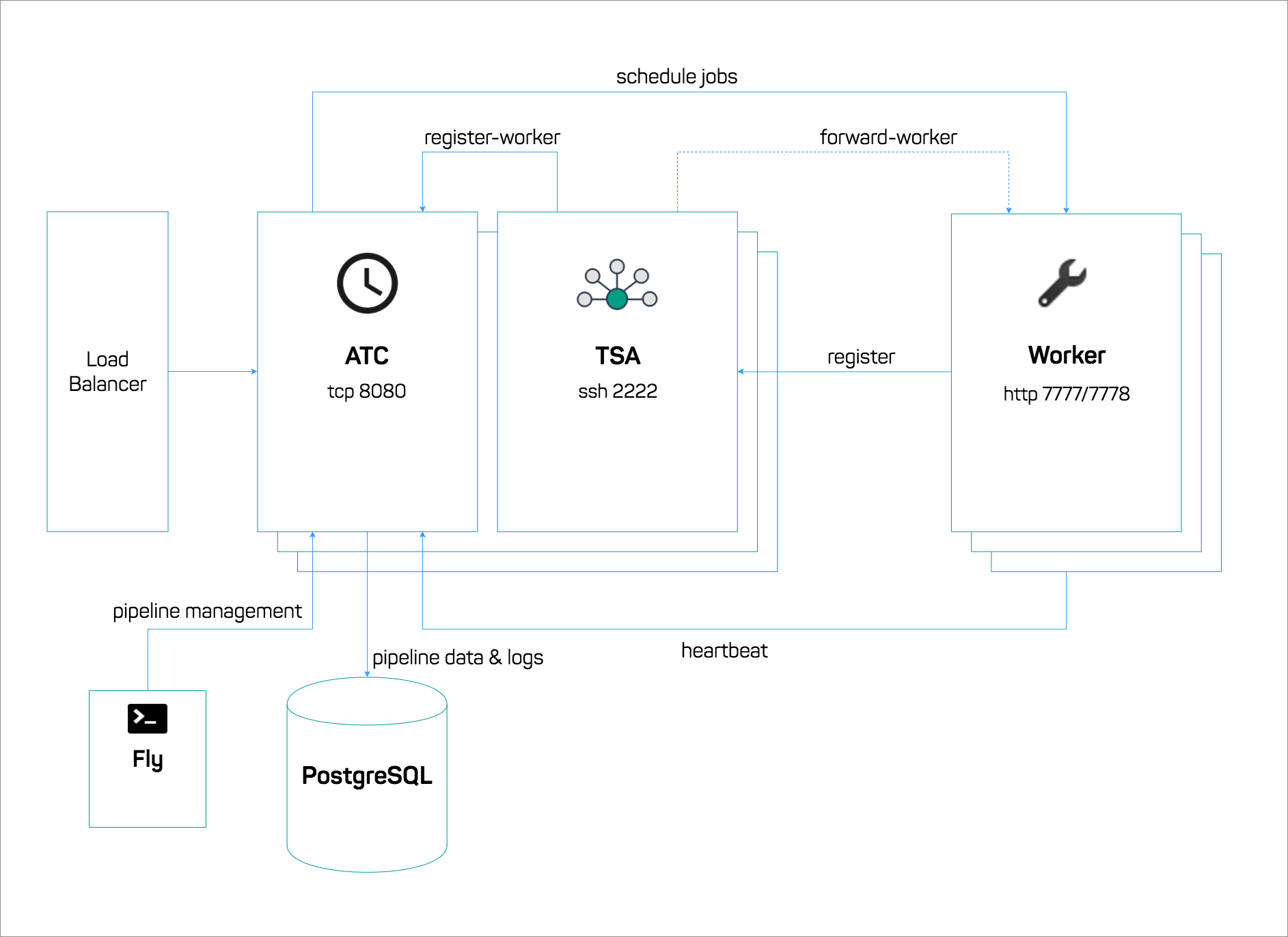 Air Traffic Control (ATC) ist die zentrale Instanz des Systems und bietet eine Benutzeroberfläche zur Darstellung und eine REST API für das Management der Pipelines und deren Ausführung. Transport Security Administration (TSA) ist eine Schnittstelle zwischen ATC und den Workern, wobei die Worker lediglich registriert und an ATC weiter geleitet werden. Die Worker sind unabhängige und einheitliche Server, die als Container für die Ausführung der Jobs verwendet werden. Sie sind stateless, benötigen keine zusätzliche Konfiguration und registrieren sich am TSA als mögliche Laufzeitumgebung für die Pipeline. Wann, wo und wie ein Worker zum Einsatz kommt, wird von ATC gesteuert. Für das optimale Scheduling der Worker melden diese ihren Zustand periodisch an ATC.