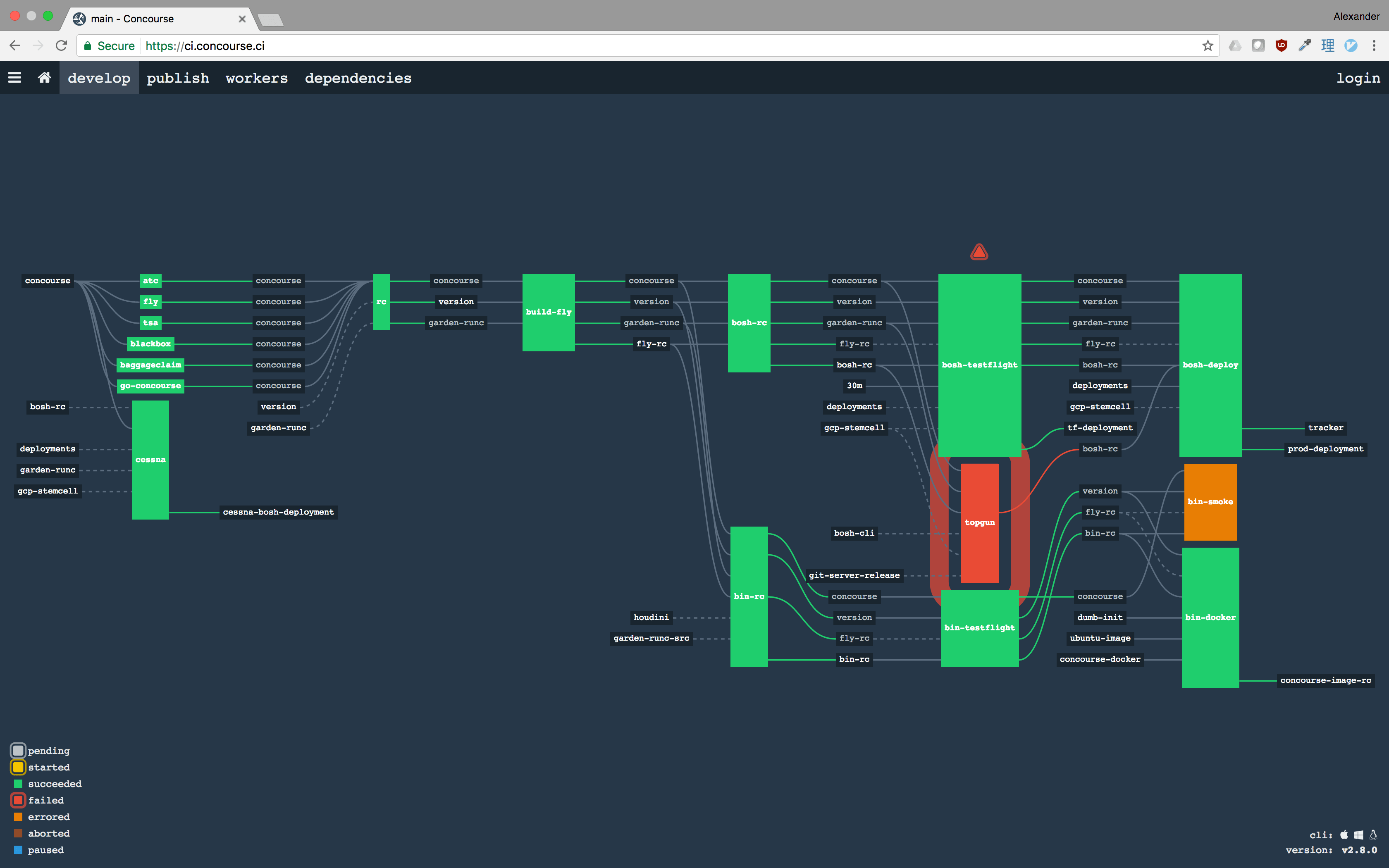 Eine weitere Stärke von Concourse ist die Benutzeroberfläche, in der die Pipelines, Jobs und Resources minimalistisch dargestellt werden. Aufgrund der zunehmenden Komplexität der Build-Pipelines ist es in anderen Systemen oft schwierig, die wesentliche Information möglichst schnell zu finden. Als Beispiel kann die Pipeline von Concourse selbst betrachtet werden.