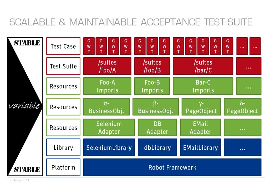 Die Notwendigkeit, Änderungen an der Test-Suite durchzuführen, ergibt sich also zum Einen aus Änderungen an den Anforderungen, und zum anderen aus Änderungen in der Umsetzung. Und was für einen einzelnen Test gilt, gilt natürlich erst recht für eine ganze Test-Suite. Wie soll eine ganze Test-Suite aber aufgebaut sein, um sich den Änderungen möglichst gut anpassen zu können? Offenbar gibt es Teile, die eher stabil sind und Teile, die flexibel und variabel sind.