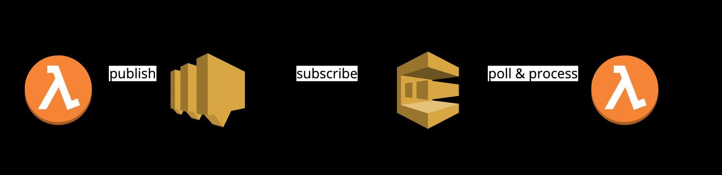 Kommunizieren Domänen untereinander über Events, sieht das konkret so aus: Eine Function sendet über einen Pub-Sub-Service wie AWS SNS eine Message auf einem Topic. Die konsumierende Function der anderen Domäne kann das Topic abonnieren, dessen Messages empfangen und verarbeiten. Meistens gibt es jedoch gute Gründe dafür, zwischen SNS-Topic-Abonnements und der verarbeitenden Function eine Queue einzusetzen. Die Queue empfängt dann SNS-Messages und hält diese vor, bis die Function sie erfolgreich verarbeiten kann oder die Message ablaufen soll. Schlägt die Verarbeitung fehl (etwa weil ein benötigtes Drittsystem offline oder überlastet ist), wird die Message zurück in die Queue gestellt, um später erneut an die Reihe zu kommen.