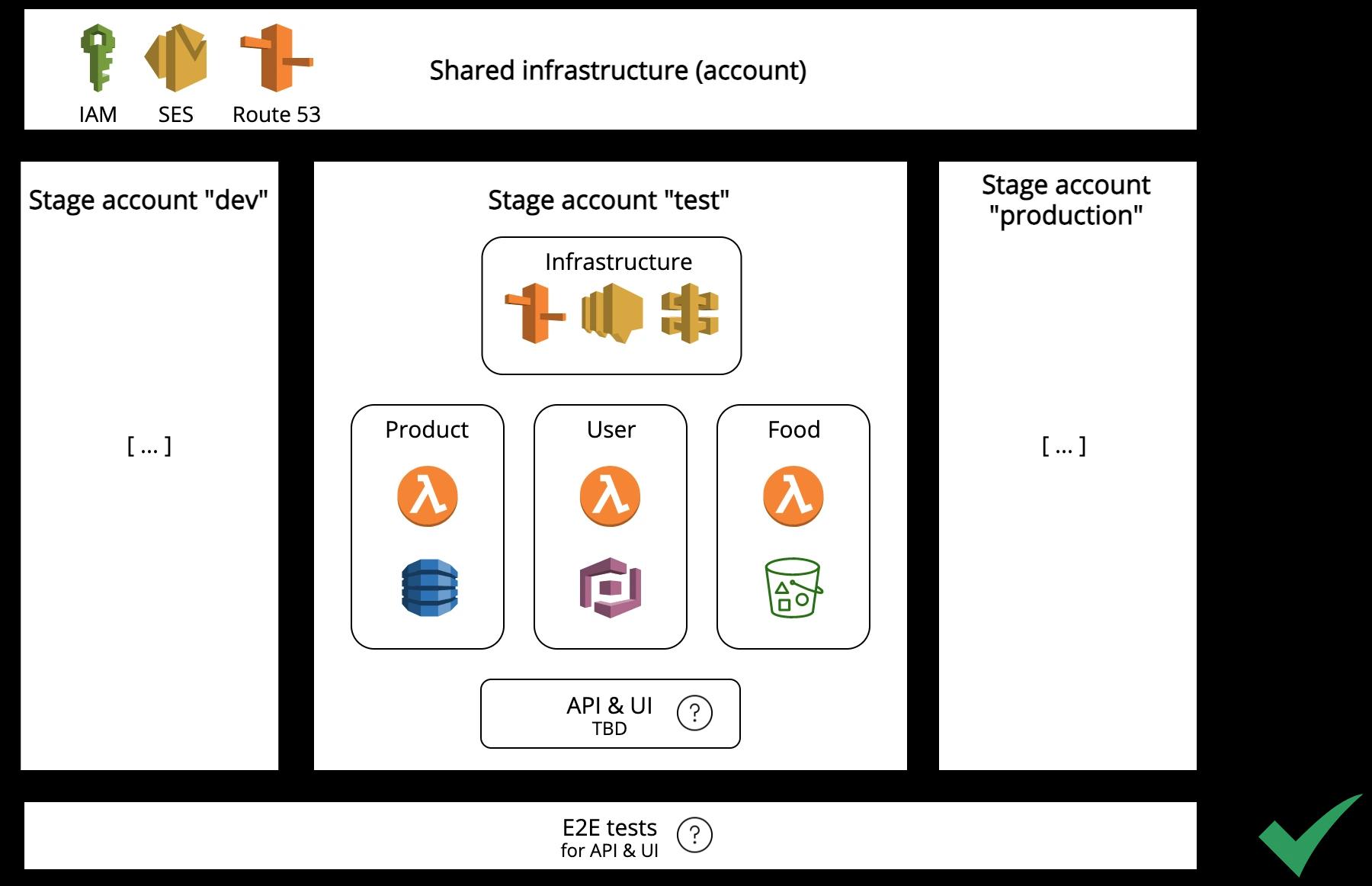 Mit Staging und einer Multi-Account-Strategie ist, auch in nicht-serverlosen Systemen in der Cloud, ein solider Anfang gemacht. Nun stehen unserem Projekt die wichtigsten Strukturen zur Ausgestaltung zur Verfügung. Es ist Zeit, diese mit Fachlichkeit und Technik zu füllen.