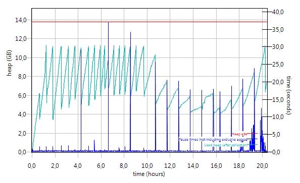 Wir sehen ein relativ großzügig dimensioniertes System eines unserer Kunden mit 14 GB Heap. Diesem Kunden haben wir geholfen den Speicherverbrauch seiner Anwendung zu reduzieren, jedoch gibt es immer noch Pausenzeiten. Der oben abgebildete Graph stammt aus dem Garbage Collection Log und zeigt die Ursache für die Pausen. Die blaue Kurve unten zeigt Garbage Collection. Doch warum gibt es 13 Garbage Collection Spitzen mit bis zu 35 Sekunden, während die zahlreichen anderen Garbage Collections sehr sehr kurz sind?