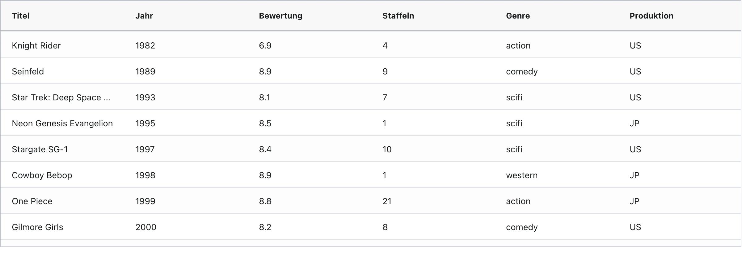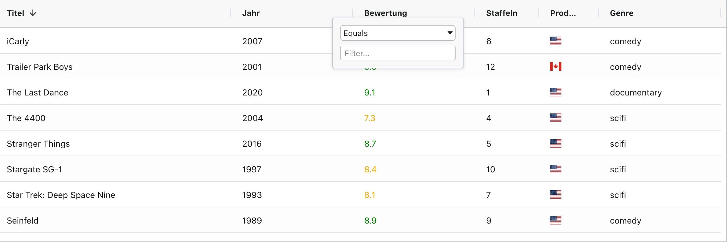 In einem neuen Objekt, der defaultColDef, haben wir Anpassungen vorgenommen, die für alle Columns gültig sind (außer wenn explizit anders notiert). In unserem Fall sollen alle Spalten filterbar, sortierbar sowie skalierbar sein. Zusätzlich haben dann in den spezifischen ColumnDefs die Spalten Filter erhalten, die von AG Grid für ihre Datentypen mitgeliefert werden. Beim Titel wurde dieser Filter aber exemplarisch angepasst. Der Filter erhält einen *filterText *(die Eingabe des Nutzers) sowie einen *value *(der Inhalt der Zelle) und wir können verändern, wie die Werte verglichen werden sollen. In unserem Fall heißt das, dass bei beiden Strings die Doppelpunkte entfernt werden, um so die Suche für Titel, die Untertitel haben, etwas zu erleichtern (als Beispiel hier: Star Trek: Deep Space Nine). Der Nutzer findet den Titel jetzt also unabhängig davon, ob er den Doppelpunkt eintippt oder nicht.