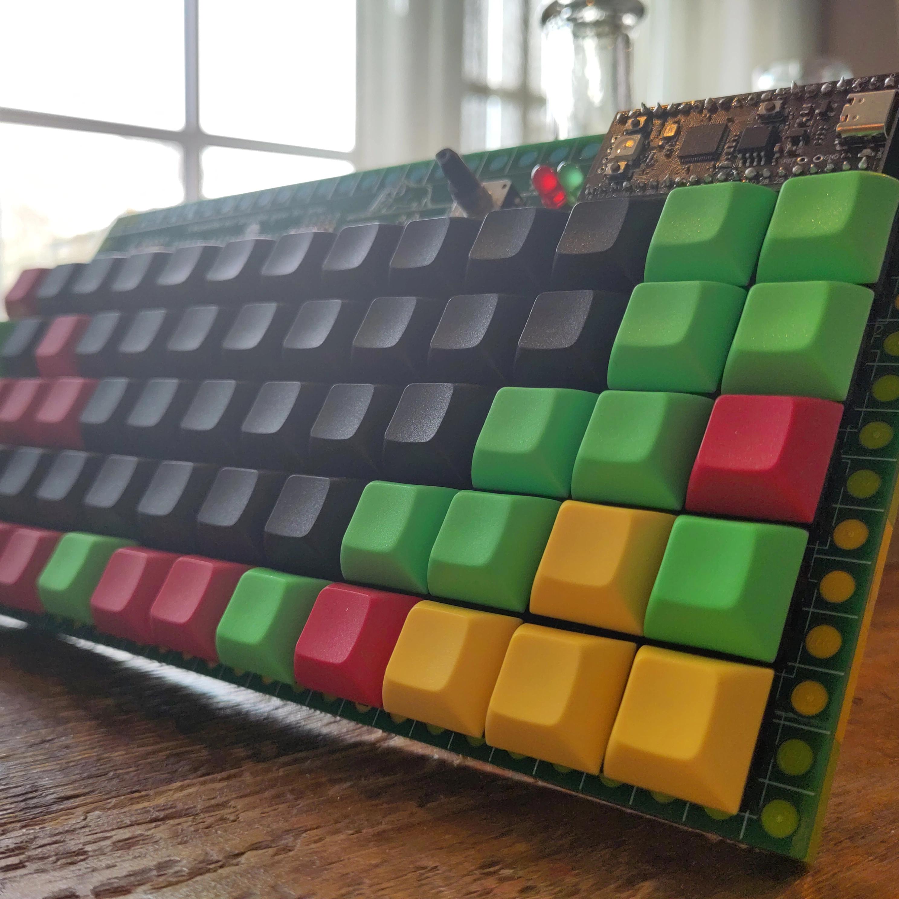Was muss nun für die Tastatur gemacht werden? Jede Taste hat einen eigenen Switch, der das Drücken der Taste in ein elektrisches Signal umsetzt. Eine Diode sorgt dafür, dass der Strom durch die Taste nur in eine Richtung fließt. Über ein Gitter auf der Leiterplatte (im Folgenden „printed circuit board", PCB) wird der Strom an alle Reihen und Spalten an Tasten geleitet und falls eine Taste gedrückt wird, kann der Raspberry Pi Zero erkennen, in welcher Zeile und welcher Spalte die Taste gedrückt wird. Der Raspberry Pi Zero wandelt das Signal auf das einprogrammierte Tastaturlayout um und sendet es an das Betriebssystem. Zwei LEDs zeigen Sondertasten an und ein Drehregler gibt uns weitere Spielfreiheit.
