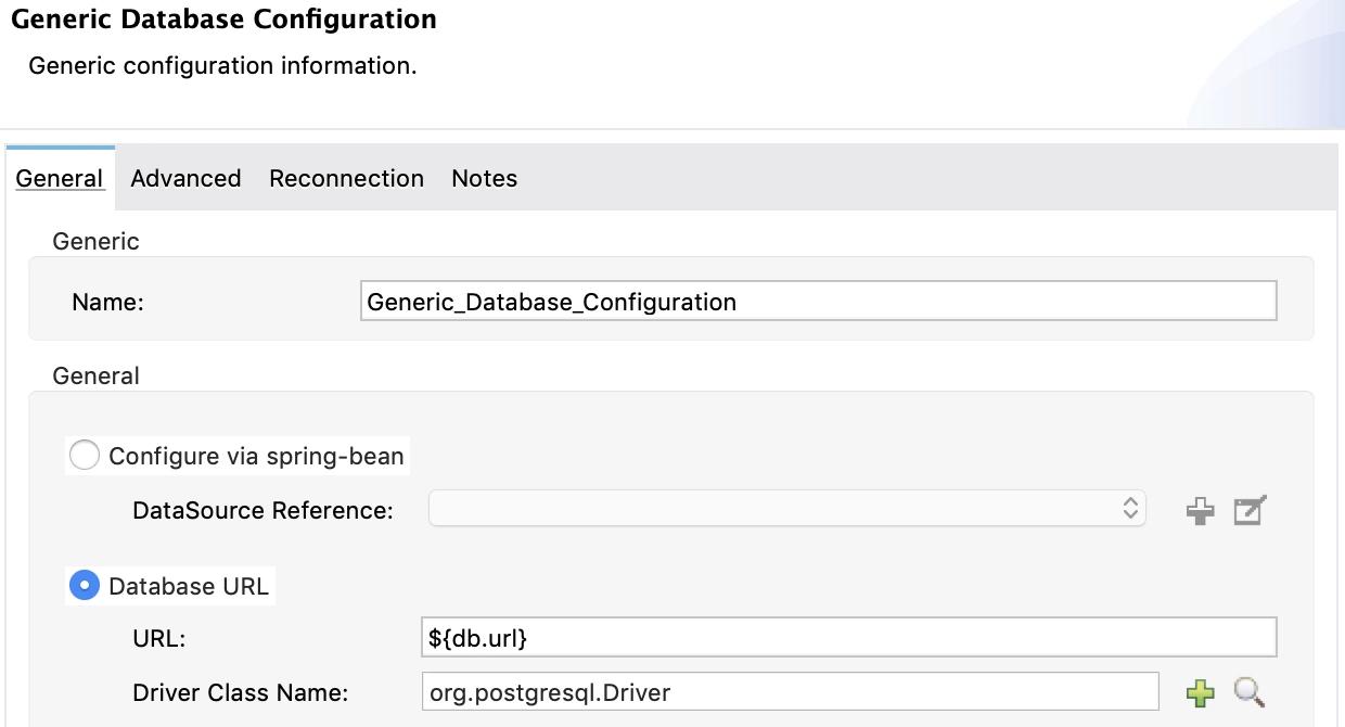 Leider setzt das die Verwendung der URL als Zugriffsmethode auf die Datenbank voraus. Aus Mule-Sicht bedeutet das, dass die URL-Connection in den Connector-Konfigurationen verwendet werden muss, nicht die einzeln spezifizierten Bestandteile wie Host, Port, Database oder die Spring-Bean.
