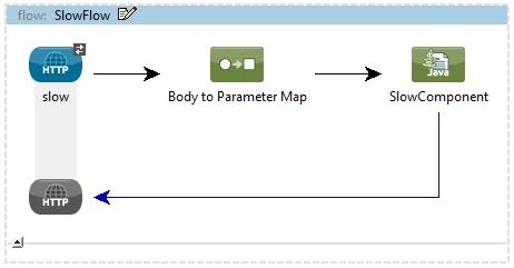 1<flow name="SlowFlow" doc:name="SlowFlow"> 2 <http:inbound-endpoint exchange-pattern="request-response" 3 host="localhost" 4 port="8080" path="slow" 5 doc:name="slow" 6 mimeType="text/plain" 7 connector-ref="HTTP" /> 8 <http:body-to-parameter-map-transformer doc:name="Body to Parameter Map" /> 9 <component class="de.codecentric.perftest.SlowComponent" doc:name="SlowComponent" /> 10</flow>