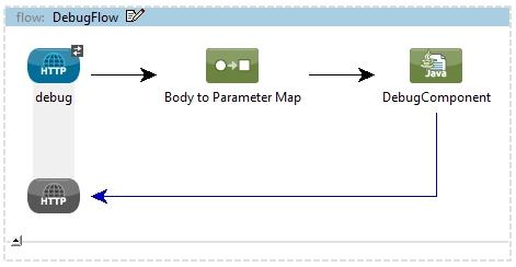 1<flow name="DebugFlow" doc:name="DebugFlow"> 2 <http:inbound-endpoint exchange-pattern="request-response" 3 host="localhost" 4 port="8080" 5 path="debug" 6 doc:name="debug" 7 mimeType="text/plain"/> 8 <http:body-to-parameter-map-transformer doc:name="Body to Parameter Map" /> 9 <component class="de.codecentric.basics.DebugComponent" 10 doc:name="DebugComponent" /> 11</flow>
