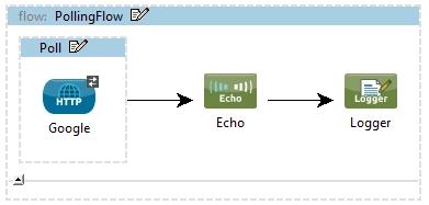 1<flow name="PollingFlow" doc:name="PollingFlow"> 2 <poll frequency="10000" doc:name="Poll"> 3 <http:outbound-endpoint exchange-pattern="request-response" 4 host="www.google.de" 5 port="80" 6 method="GET" 7 doc:name="Google" /> 8 </poll> 9 <echo-component doc:name="Echo" /> 10 <logger message="#[message.payload]" level="INFO" doc:name="Logger" /> 11</flow>