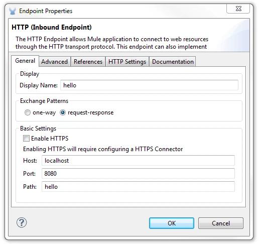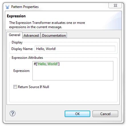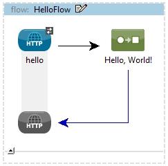 1<flow name="HelloFlow" doc:name="HelloFlow"> 2 <http:inbound-endpoint exchange-pattern="request-response" 3 host="localhost" 4 port="8080" 5 path="hello" 6 doc:name="hello" 7 mimeType="text/plain"/> 8 <expression-transformer expression="#['Hello, World!']" 9 doc:name="Hello, World!" /> 10</flow>