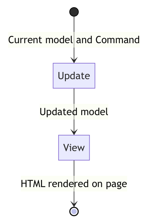 Grundsätzlich arbeitet das Elmish-Framework mit einem Model, dessen initialem Zustand, verschiedenen Transformationen aufgrund von Ereignissen (Commands) sowie dem eigentlichen Erstellen der View.
