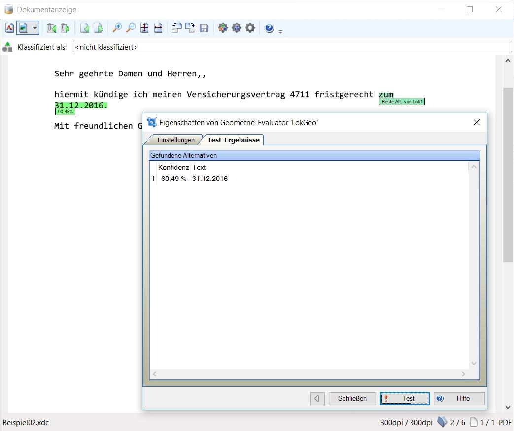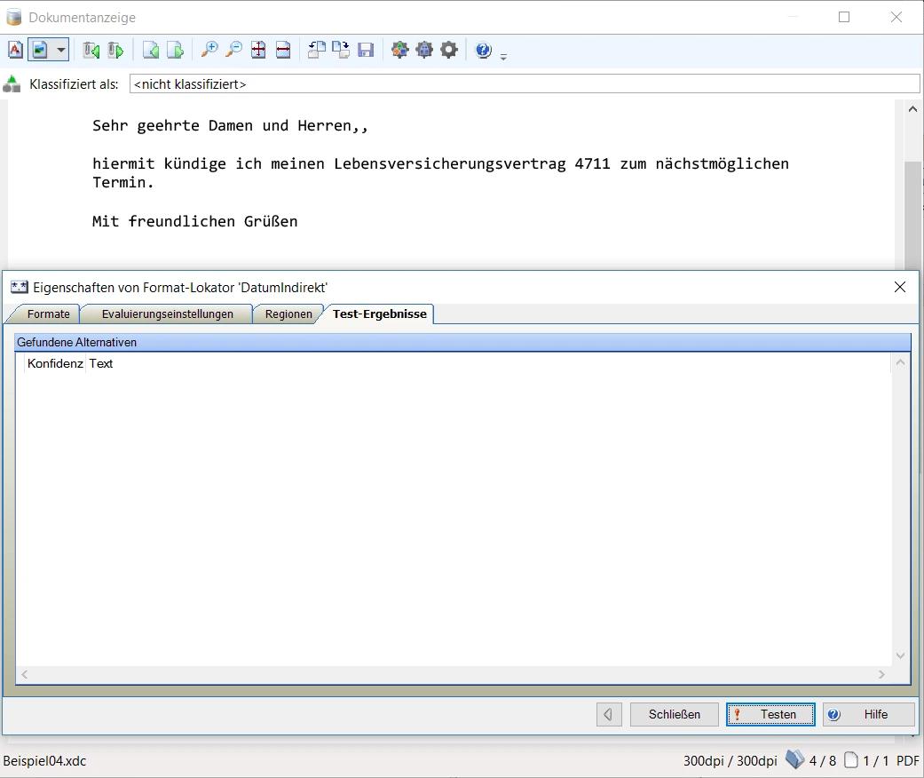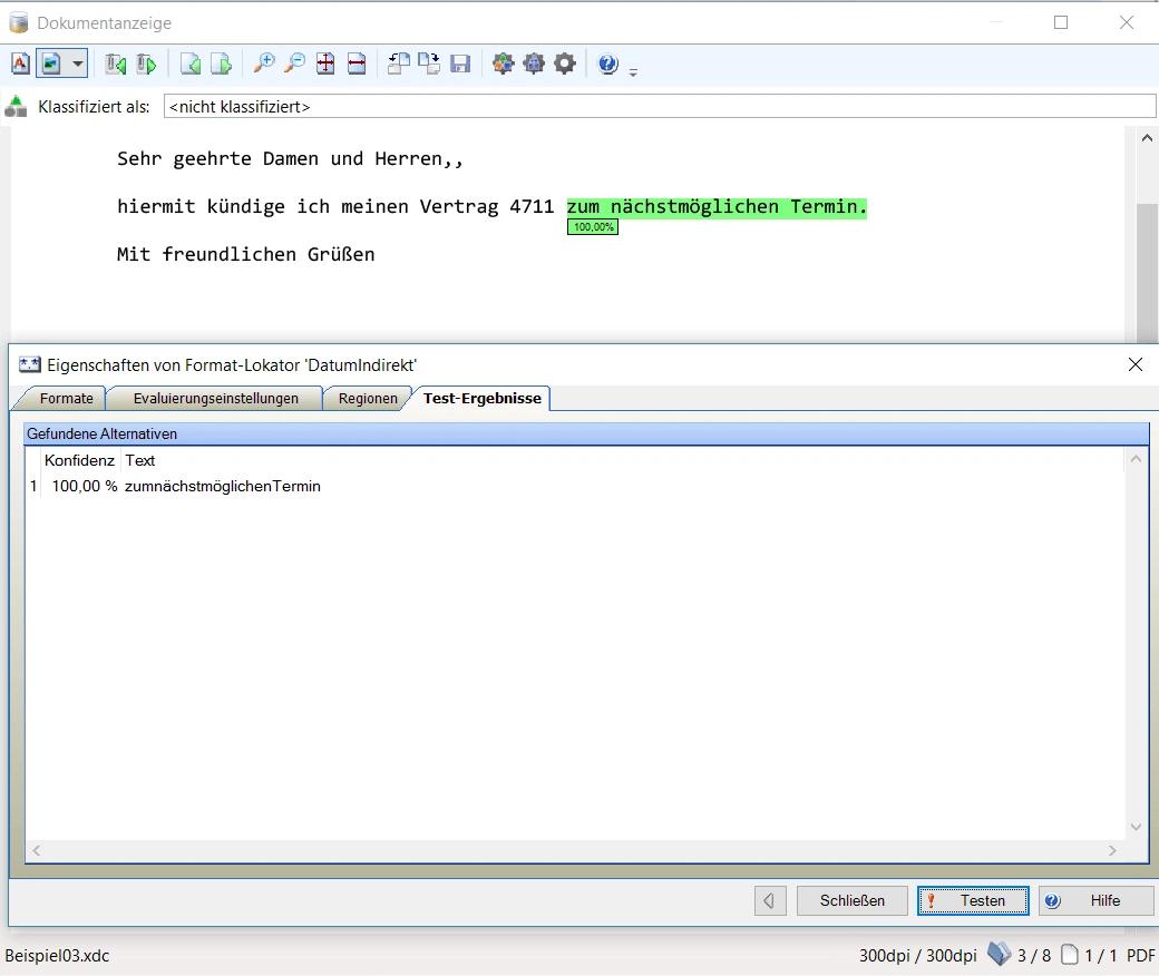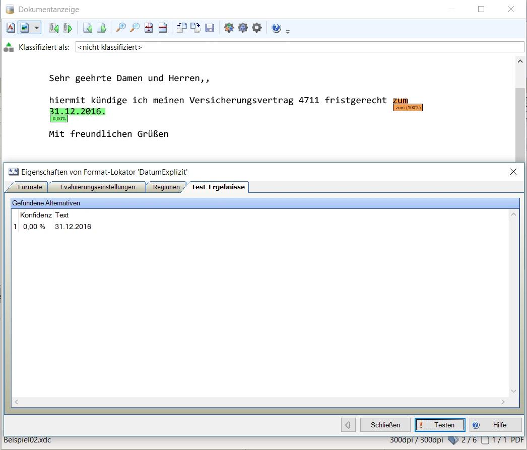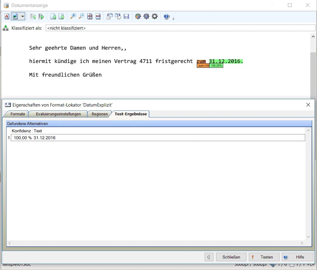 Durch die frühzeitige Klassifizierung der Dokumente in KTM als Kündigung, kann die Versicherung zeitnah Aktionen starten, um den Kunden eventuell doch noch zu halten. Die dennoch verbleibenden durchzuführenden Kündigungsprozesse sollen dann möglichst automatisiert durchgeführt werden. Dazu musste mit KTM das im Schreiben angegebene Kündigungsdatum extrahiert werden, um damit die nachfolgenden Prozesse starten zu können.
