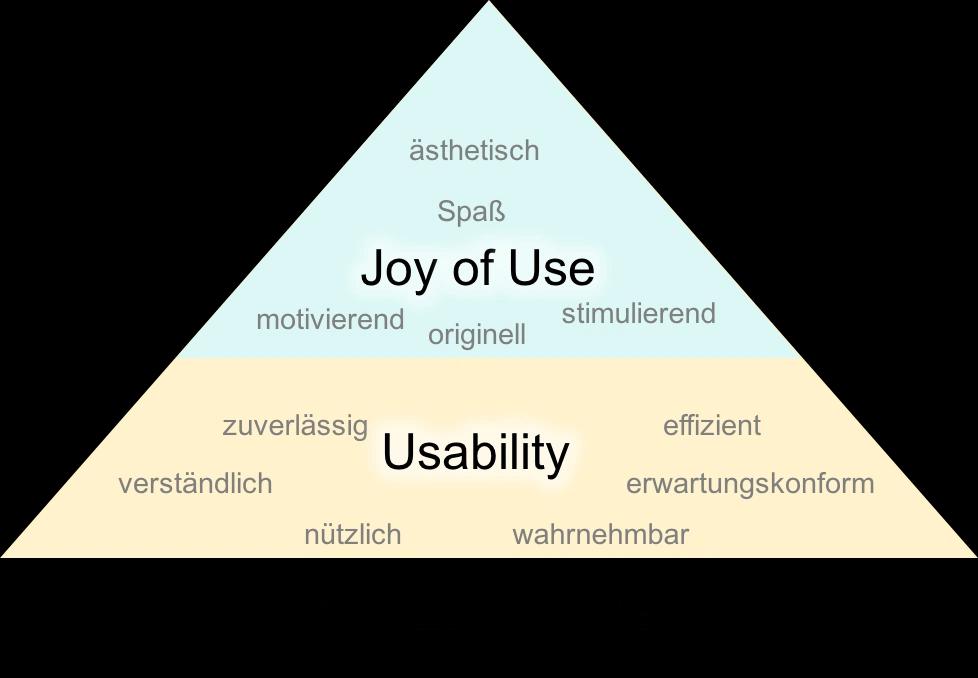 Mir ist an dieser Stelle aber auch die Gewichtung dieser Kriterien wichtig. Gerade wenn wir Benutzerschnittstellen gestalten, die im Geschäftsumfeld eingesetzt werden, ist die Usability die Grundlage. Solange diese Grundlagen nicht stimmen, sollten wir auch keine Zeit investieren den Joy of Use unserer Anwendung zu verbessern. Im Gegenteil: Eine Investition in den Joy of Use unseres Interfaces bei einer Software, die nicht zuverlässig funktioniert, würde uns von unseren Anwendern sogar negativ ausgelegt werden.