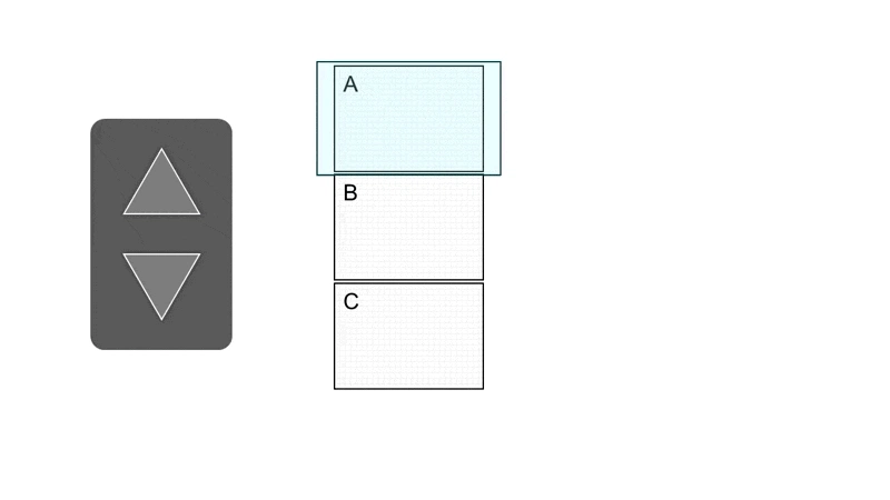 Beim zweiten Modell “Endlospapier” ist unsere Kamera nicht mehr beweglich, sondern steht starr an einer Stelle. Dafür hängen alle Folien aneinander – die älteren unter uns erinnern sich vielleicht noch an Drucker-Endlospapier. In diesem Modell ziehen wir die Folien quasi an der Kamera vorbei. Um zur nächsten Folie zu gelangen, drücke ich also den oberen Knopf. Damit ziehe ich den Satz Folien nach oben, um so die nächste Folie vor der virtuellen Kamera zu positionieren.