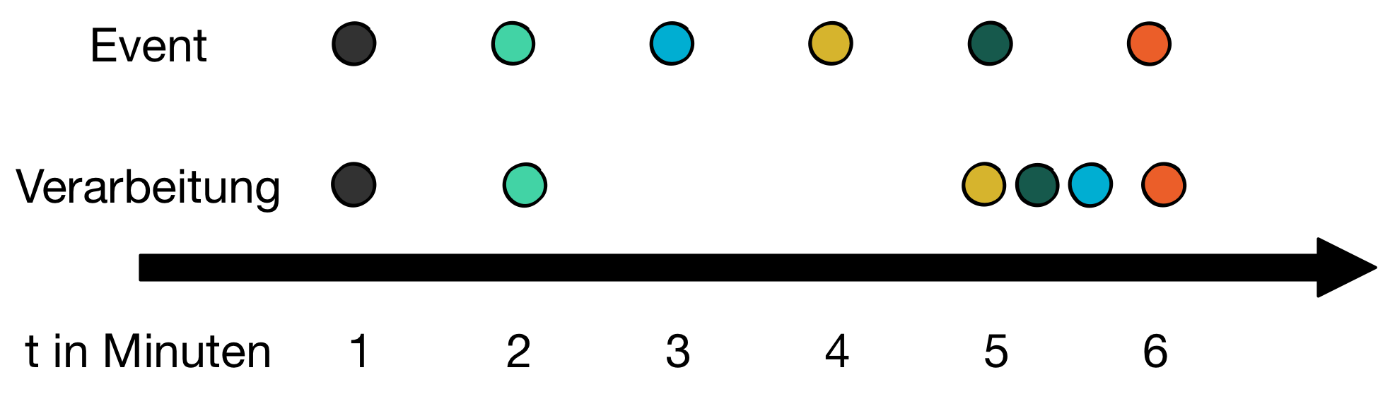 Abb. 1: Exemplarische Darstellung von Eventzeit und Verarbeitungszeit. Mit verspäteten (Gelb, Grün, Rot) und Out-of-order Events (Blau)