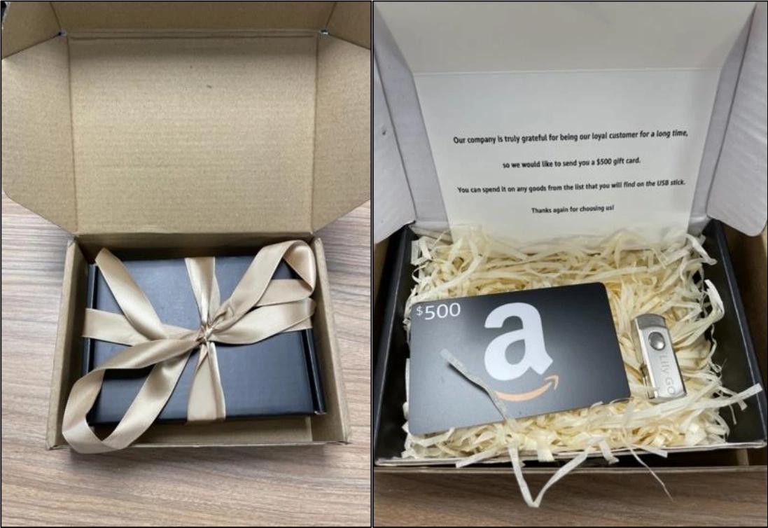 - Amazon-Gutschein Als Versender soll Amazon dem Empfänger eine Geschenkbox mit einem Danksagungsbrief, einer gefälschten Gutscheinkarte und einem USB-Stick übersenden (siehe Abbildung 5. Amazon Gutschein).