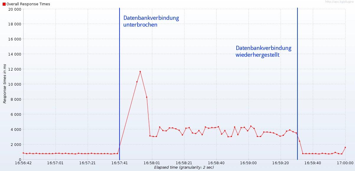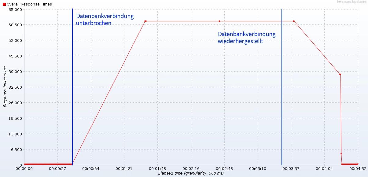 Solange die DB erreichbar ist, liegen die Antwortzeiten bei ca. 300 ms. Nachdem die Verbindung zur DB getrennt wurde, schnellen die Antwortzeiten auf über eine Minute hoch. Dass der Graph überhaupt noch lesbar ist (und die Spitze nicht in den Wolken verschwindet), liegt daran, dass im JMeter Test ein Client-Timeout von 60 Sekunden gesetzt ist. Tatsächlich antwortet die Anwendung überhaupt nicht mehr!