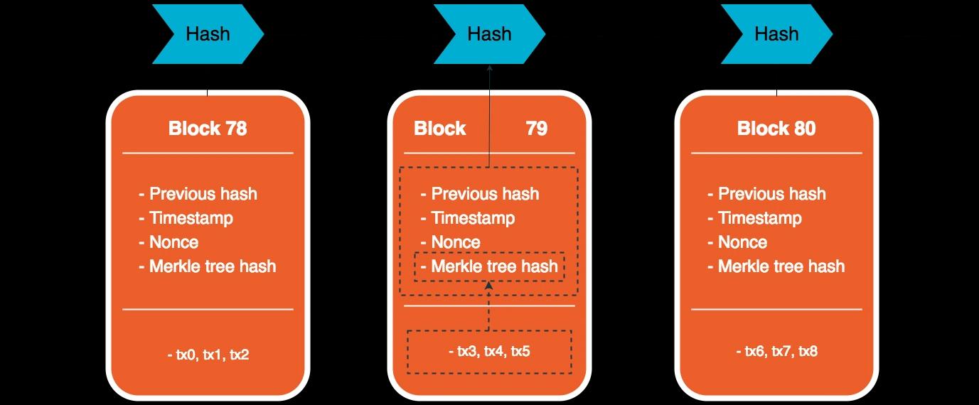 Dadurch, dass die Informationen im Header gehasht und dieser Hash wiederum im nächsten vorkommenden Block referenziert wird, wird die Integrität der Blockchain hergestellt.