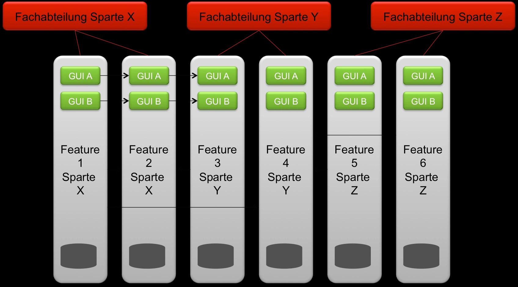 Hier haben Teams die komplette Verantwortung für GUI, Logik und Persistenz für eine bestimmte Fachlichkeit. Der Umfang der Vertikalen kann beispielsweise über das Werkzeug der Bounded Contexts ermittelt werden, und die Anzahl der Vertikalen sollte nicht festgeschrieben sein, es kann sich sehr wohl die Situation ergeben, dass neue Vertikale entstehen. Ein Team kann je nach Umfang auch für mehrere Vertikale verantwortlich sein. Diese Graphik sagt außerdem nichts darüber aus, wie viele Artefakte gebaut werden oder wie diese betrieben werden. Sie können sich sehr wohl in einen gemeinsam betriebenen Monolithen integrieren, genauso kann es aber auch innerhalb der Vertikalen mehrere Anwendungen geben, die evtl. für unterschiedliche Schichten zuständig sind. Es geht erst einmal nur um die Organisation. Wenn Features in einem bestimmten Bereich umgesetzt werden sollen, haben die Fachbereiche klare Ansprechpartner, die für die Gesamtumsetzung verantwortlich sind. Abhängigkeiten zwischen den Vertikalen möglichst lose zu implementieren, ist unsere Kunst, Werkzeuge und Pattern dafür sind beispielsweise
