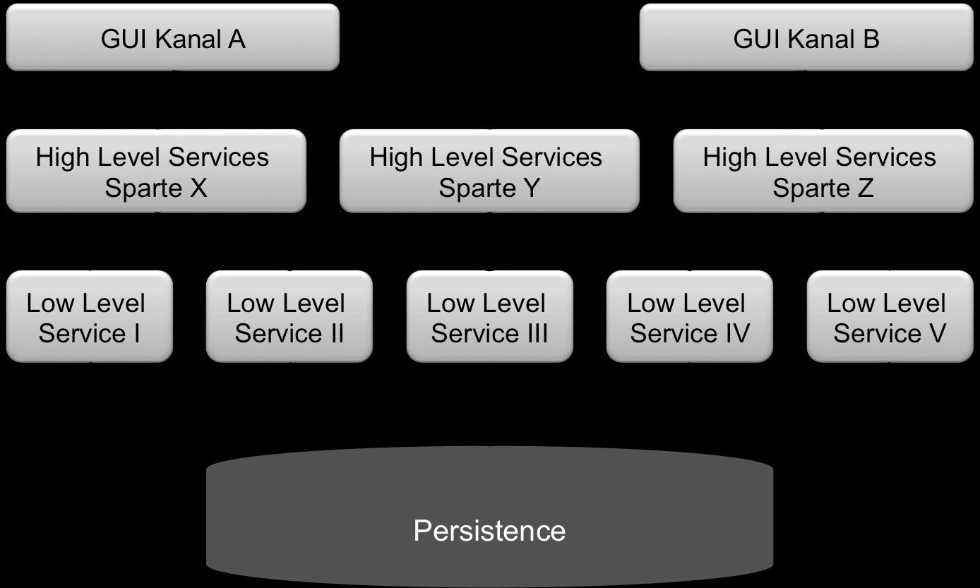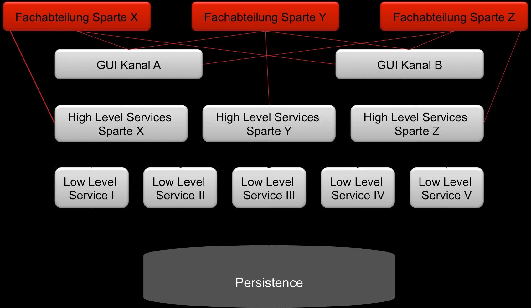 Auch die Fachabteilungen haben für die Implementierung eines Anwendungsfalls nicht ein Team als Ansprechpartner, sondern mehrere. Häufig wird außerdem die Datenbank als Integrationsschicht angesehen und Tabellen werden von mehreren Low-Level-Services angesprochen, so dass kleine Änderungen des Datenmodells ebenfalls komplexe Abstimmungen zur Folge haben.