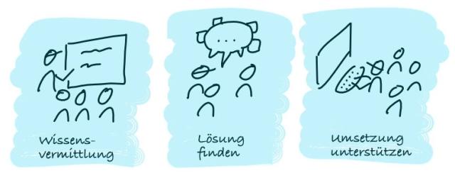 Heutzutage sind die Kontexte häufig sehr komplex, deshalb wird neben dem Training auch über mögliche andere Lösungsvarianten des Problems gesprochen. Zum Beispiel im Rahmen eines Workshops werden die Lösungsoptionen erarbeitet und gemeinsam bewertet. Dabei fließt das Expertenwissen des Beraters weiterhin ein.