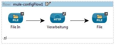 Links sieht man eine Schnittstelle vom Typ „File“, sie liest Dateien. In der Mitte ist der Transformer, der mit den Daten irgendeine Umwandlung vornimmt, rechts ist wieder eine Schnittstelle vom Typ „File“, die eine Datei schreibt. Es handelt sich hier um eine „one way“ Verarbeitung: Der Absender legt seine Datei ab und kümmert sich nicht um den weiteren Ablauf. Sobald eine Datei vorliegt, kann der ESB sie sofort vollständig verarbeiten, er muss auf keine anderen System warten.