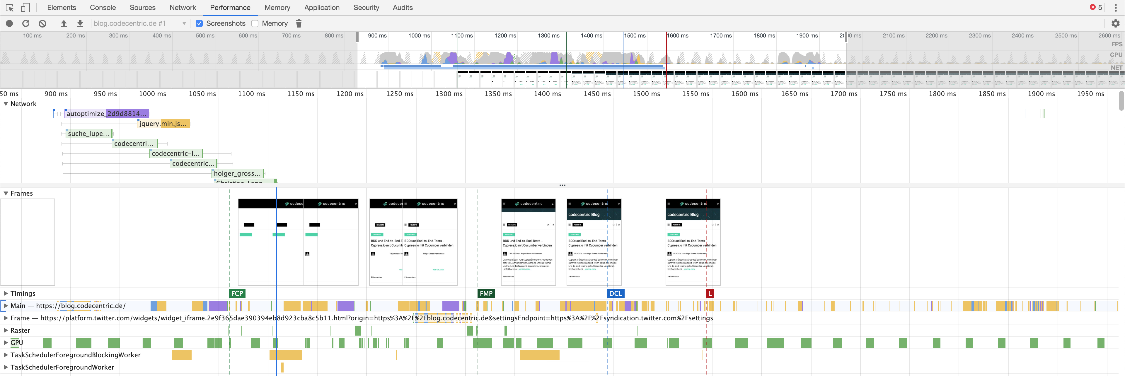 First Meaningful Paint bezeichnet die benötigte Zeit zum Darstellen des ersten primären (für die Zielgruppe sinnvollen) Inhalts einer Seite. FMP ist kein Wert, der sich standardisieren lässt, da es von Seite zu Seite verschieden ist, welche Inhalte Primärinhalte sind und welche nicht. Beim Laden des codecentric Blogs (siehe Bild oben) kann FMP beispielsweise der Zeitpunkt sein, wenn Titel und Teasertexte der sichtbaren Blogartikel angezeigt werden (Time-to-first-Blog). Bei einer Seite, die Nachrichten aggregiert, die Anzeige des ersten Feeds (Time-to-first-Feed).