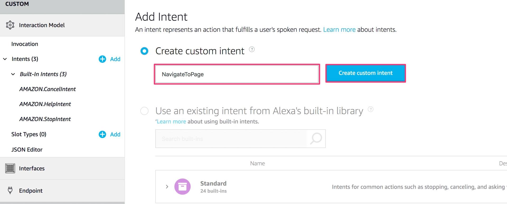 Wir wählen einen Custom Intent und vergeben den Namen “NavigateToPage”.