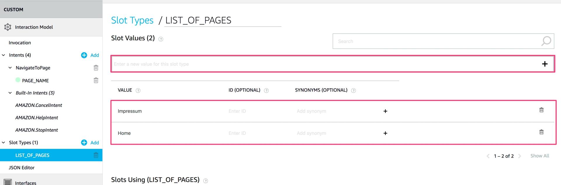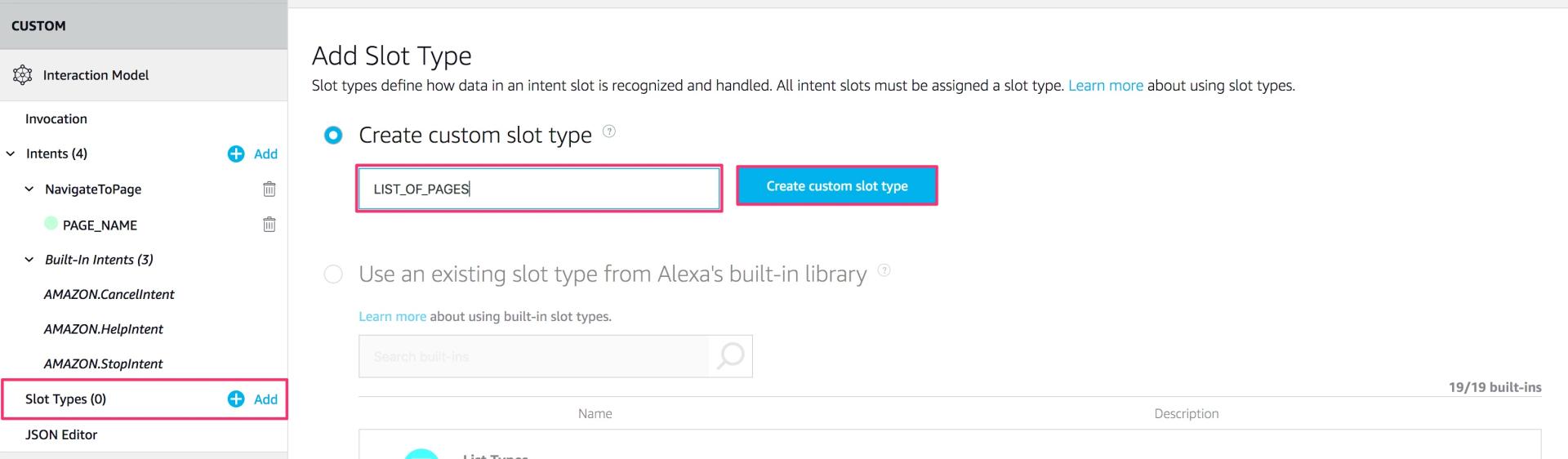 Bisher hat unser Slot “PAGE_NAME” noch keinen Slot Type. Diesen werden wir jetzt erstellen. Dazu wechseln wir in den Unterpunkt “Slot Types (0)” in der linken Navigationsleiste. Anschließend klicken wir auf den Button “+ Add Slot Type”. Wir vergeben den Namen “LIST_OF_PAGES” und bestätigen mit einem Klick auf “Create custom slot type”.