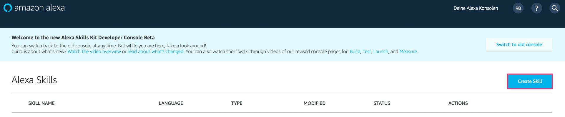 In der rechten oberen Ecke klicken wir auf den Button “Create Skill”.