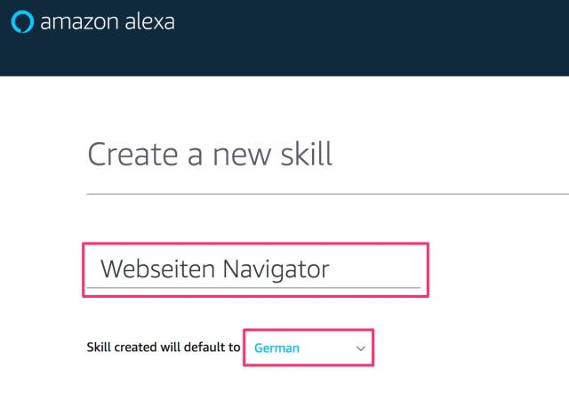 Auf der folgenden Seite wählen wir unseren Namen für den Skill. In unserem Beispiel entscheide ich mich für “Webseiten Navigator”. Als Sprache wähle ich “German”.
