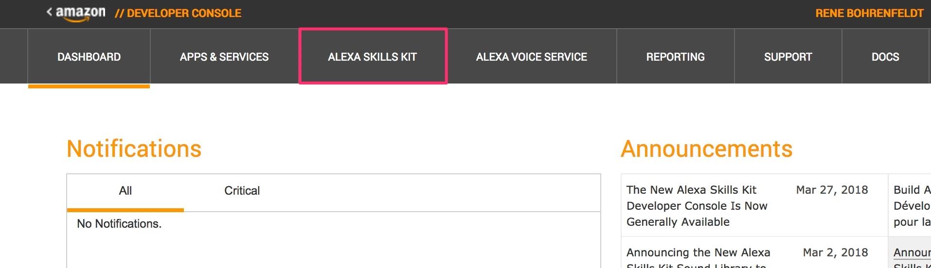 Für das Erstellen eines Alexa Skills verwenden wir das sog. Alexa Skills Kit (ASK). Dieses finden wir in der Amazon-Developer-Konsole (https://developer.amazon.com/home.html ).