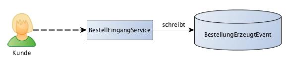 - BestellEingangService. Wird synchron vom Kunden aufgerufen und hat im Wesentlichen die Aufgabe, eine eindeutige ID der Bestellung zu erzeugen, die im gesamten System verwendet wird. Schreibt die Bestellung dann mit erzeugter ID in ein BestellungErzeugtEvent.