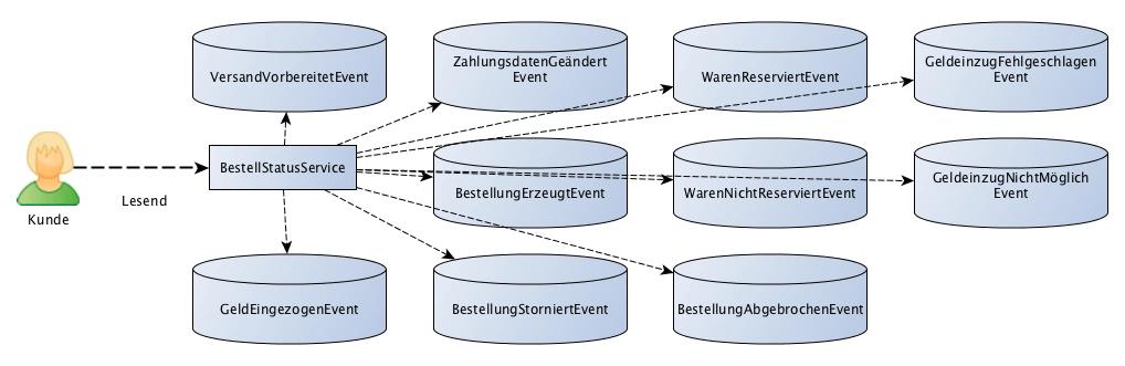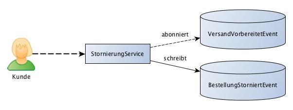 - StornierungService. Horcht auf VersandVorbereitetEvents, um eine Stornierung direkt zu verhindern, wenn der Versand einer Bestellung bereits vorbereitet wurde. Hat eine synchrone Schnittstelle für das Auslösen einer Stornierung, die bei erlaubter Stornierung ein BestellungStorniertEvent schreibt.