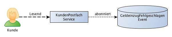 - KundenPostfachService. Horcht auf GeldeinzugFehlgeschlagenEvents und stellt dem Kunden eine Nachricht ins Postfach, die ihn darauf hinweist, innerhalb von zwei Tagen seine Zahlungsdaten zu korrigieren.