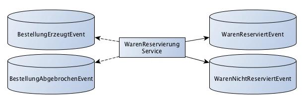 - WarenReservierungService. Dieser Service horcht auf BestellungErzeugtEvents und versucht dann, die bestellten Waren zu reservieren. Gelingt das, wird ein WarenReserviertEvent verschickt. Gelingt das nicht, wird ein WarenNichtReserviertEvent verschickt. Außerdem horcht dieser Service auf BestellungAbgebrochenEvents. Wurden die Waren für eine abgebrochene Bestellung bereits reserviert, so wird diese Reservierung gelöscht. Ansonsten merkt sich der Service, dass eine Bestellung mit der übergebenen ID abgebrochen wurde und verhindert das Reservieren der Ware, wenn ein BestellungErzeugtEvent mit der gleichen ID nachträglich noch hereinkommt.