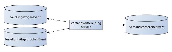 - VersandVorbereitungService. Dieser Service horcht auf GeldEingezogenEvents, bereitet den Versand vor und feuert abschließend ein VersandVorbereitetEvent. Außerdem horcht dieser Service auf BestellungAbgebrochenEvents, um bei zukünftig hereinkommenden Events mit der Bestellungs-ID die Versandvorbereitung gar nicht erst zu starten.