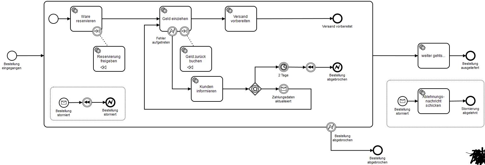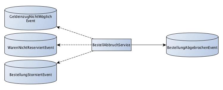 - BestellAbbruchService. Horcht auf BestellungStorniertEvents, WarenNichtReserviertEvents und GeldeinzugNichtMöglichEvents und feuert jeweils ein BestellungAbgebrochenEvent. Denkbar ist hier auch eine synchrone Schnittstelle für Sachbearbeiter.