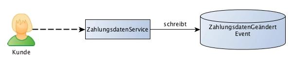 - ZahlungsdatenService. Hat eine synchrone Schnittstelle für den Kunden, der hier Daten ändern und ansehen kann. Bei Datenänderung wird ein ZahlungsdatenGeändertEvent gefeuert.