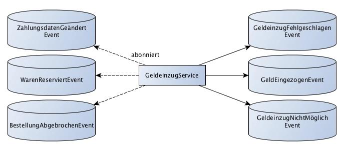 - GeldeinzugService. Dieser Service horcht auf WarenReserviertEvents und versucht dann, Geld einzuziehen. Gelingt das, wird ein GeldEingezogenEvent geschrieben, gelingt das nicht, wird zunächst ein GeldeinzugFehlgeschlagenEvent geschrieben. Folgt in den nächsten zwei Tagen kein ZahlungsdatenGeändertEvent, das die Bestellung betrifft, wird ein GeldeinzugNichtMöglichEvent geschrieben. Folgt ein passendes ZahlungsdatenGeändertEvent, so wird wieder versucht, das Geld einzuziehen und mit dem Ergebnis wie oben beschrieben umgegangen. Außerdem horcht dieser Service auf BestellungAbgebrochenEvents. Falls das Geld bereits eingezogen wurde, wird es zurückgebucht. Falls es noch keinen Eintrag zur Bestellungs-ID gibt, so merkt sich der Service die ID, damit zukünftig hereinkommende Events mit dieser ID nicht zu einem Geldeinzug führen.