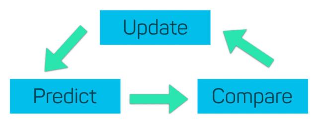 Natürlich ist man in der Praxis nicht selbst damit beschäftigt, die Feinjustierung der verschiedenen Regler eines neuronales Netzes von Hand durchzuführen. Hierfür gibt es eine Vielzahl von Algorithmen, welche diese Aufgabe für uns übernehmen und zum Trainieren neuronaler Netze eingesetzt werden. Dabei bildet die Feedback-Schleife typischerweise das Fundament dieser Algorithmen. Die entscheidende Frage an dieser Stelle ist natürlich: Wie sollen die Regler eigentlich neu eingestellt werden? Oder allgemeiner: Wie soll das Update durchgeführt werden?